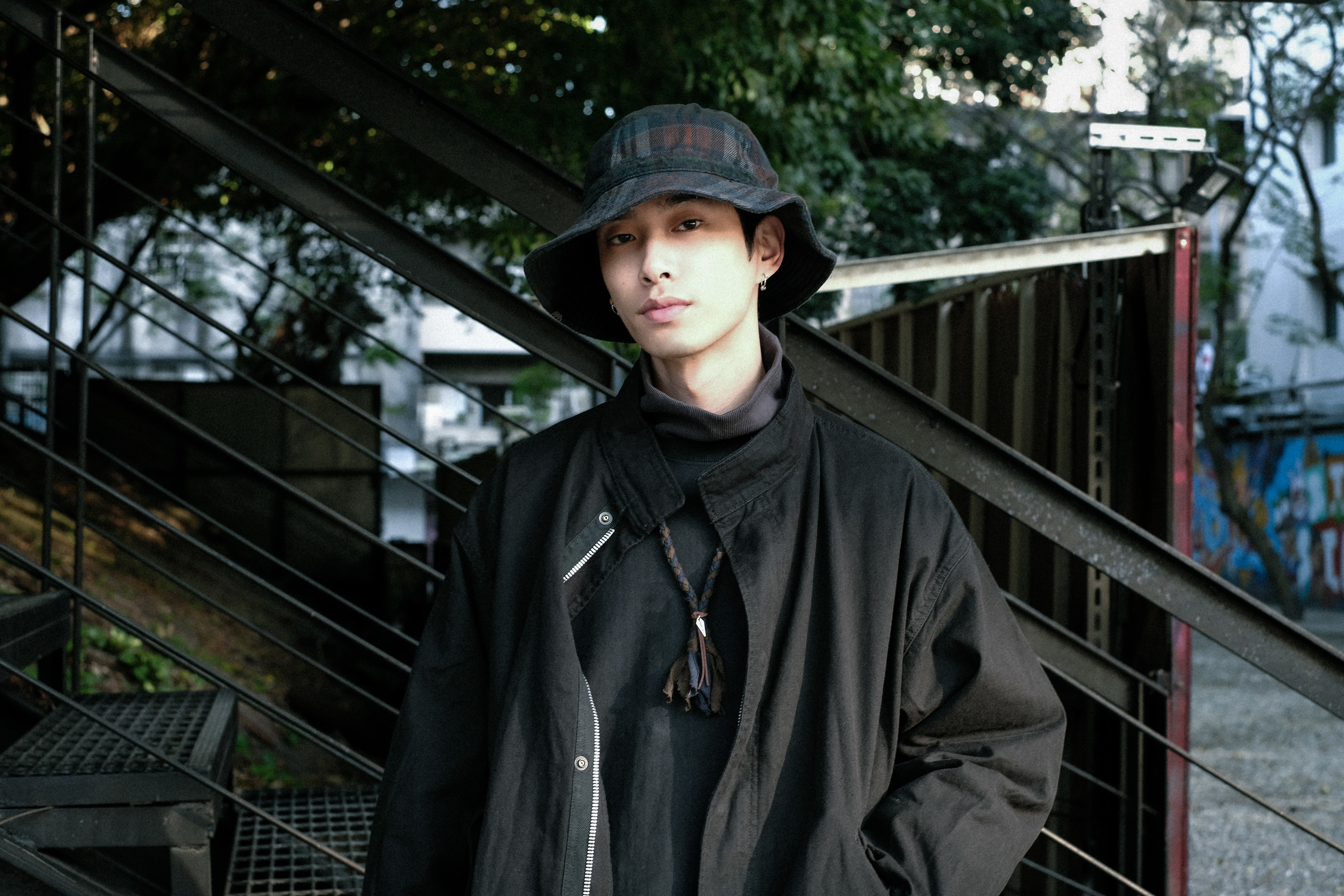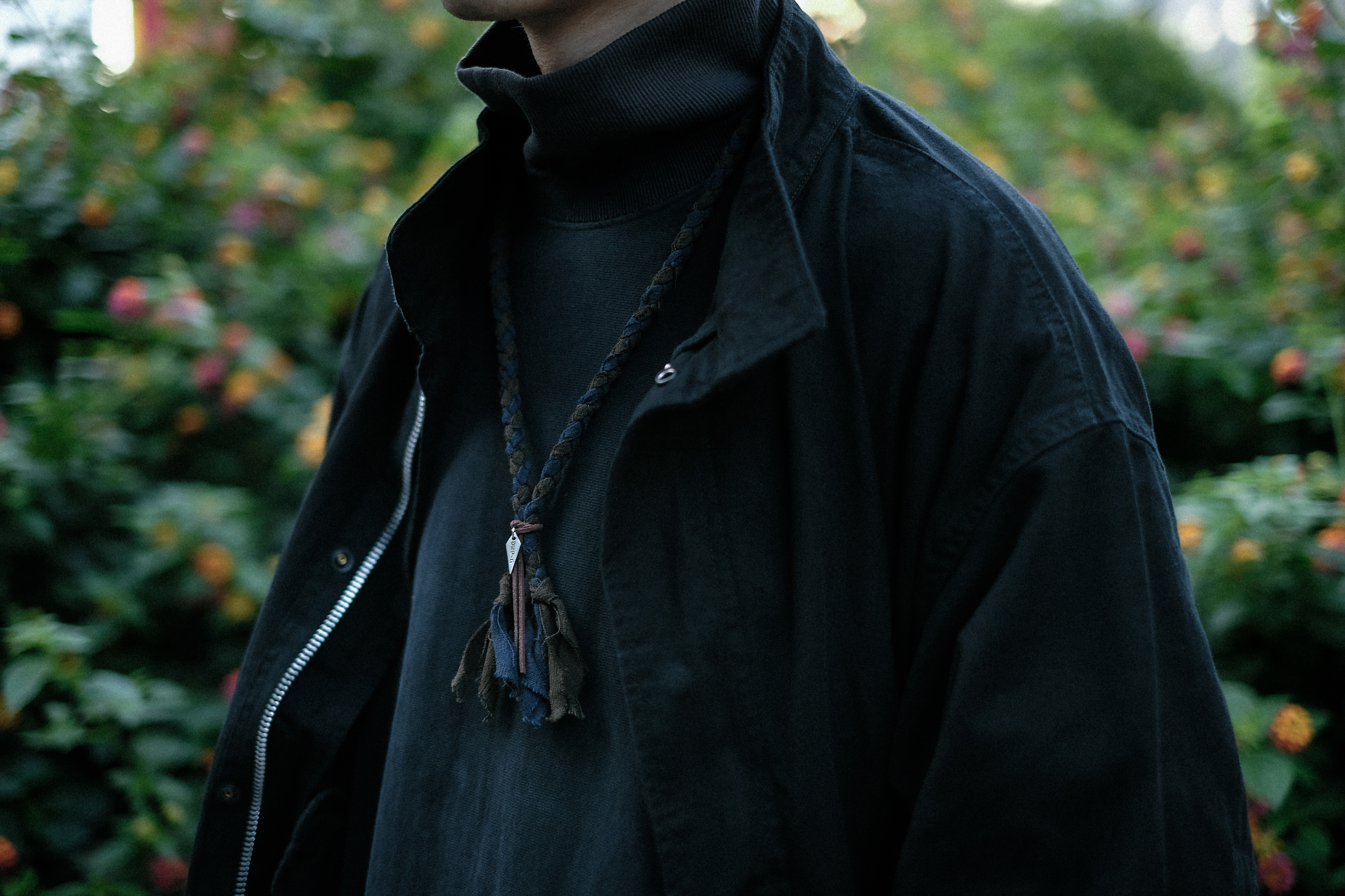 沈穩的搭配之中融入編繩項鍊與高領衛衣增添層次,